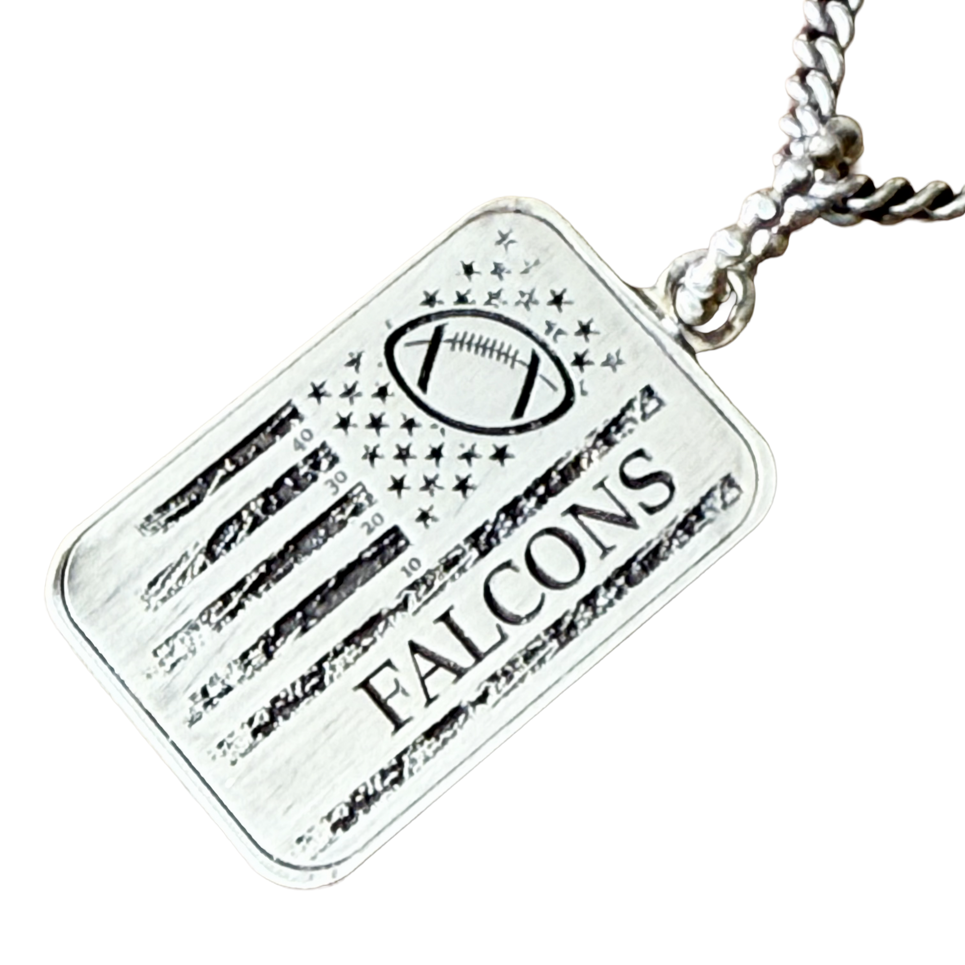 Crafted in Bucks County, PA, this sterling silver dog tag features a unique football field design, perfect for football enthusiasts. Expertly customizable, it allows you to add a team name, logo, your own name, and jersey number, creating a personalized keepsake. It is satin brushed for a timeless and durable finish Please note, the dog tag is sold without a chain, offering flexibility for you to choose your preferred style. Durable and finely detailed, it’s an ideal way to show off your team spirit with craftsmanship you can trust. Will last a lifetime. Team Engraving Included, $10 each additional.