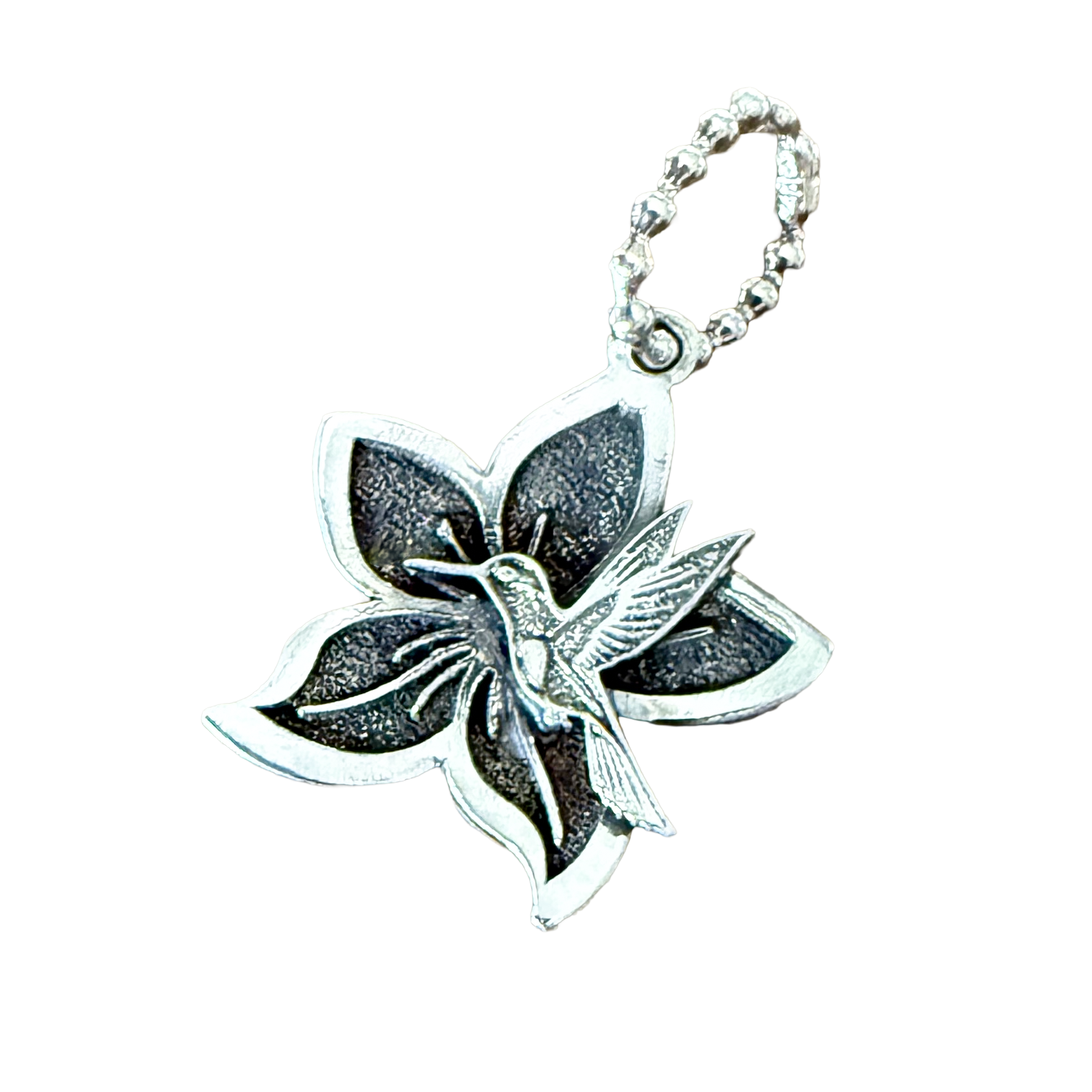 Handcrafted in Bucks County, Pennsylvania, this sterling silver pendant captures a moment of natural grace — a tiny hummingbird hovering delicately over a blooming lily.